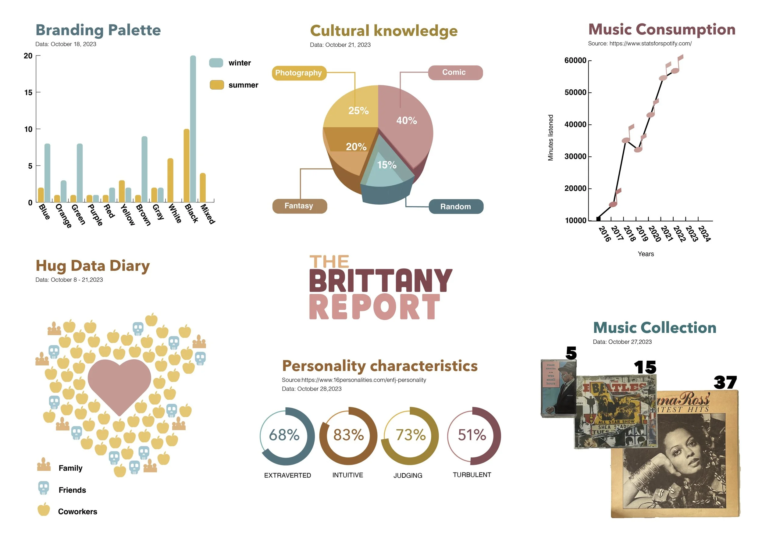 The Brittany Report consists of a variation of data collected and formatted in digestible visual illustration. Using Adobe Illustrator to convey the message effectively, create bar, pie, and line graphs. These graphs as well as imagery and drawings are used for size and quantity references. Data is all around us and using graphic design helps us better understand and process information.